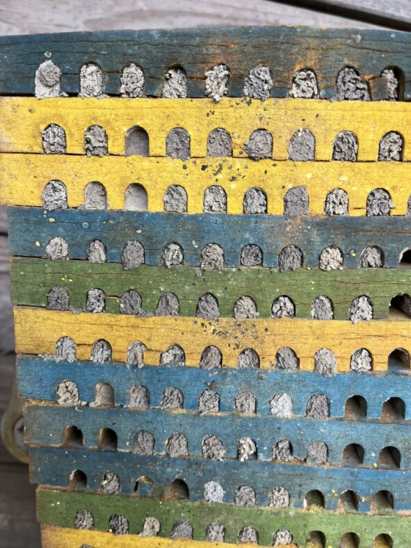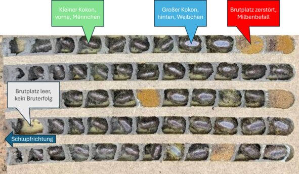 Die Brutbrettchen werden im Winter geerntet und dann erkennt man den Bruterfolg. Auf dem Bild würden die fertigen Wildbienen im nächsten Jahr nach links schlüpfen.